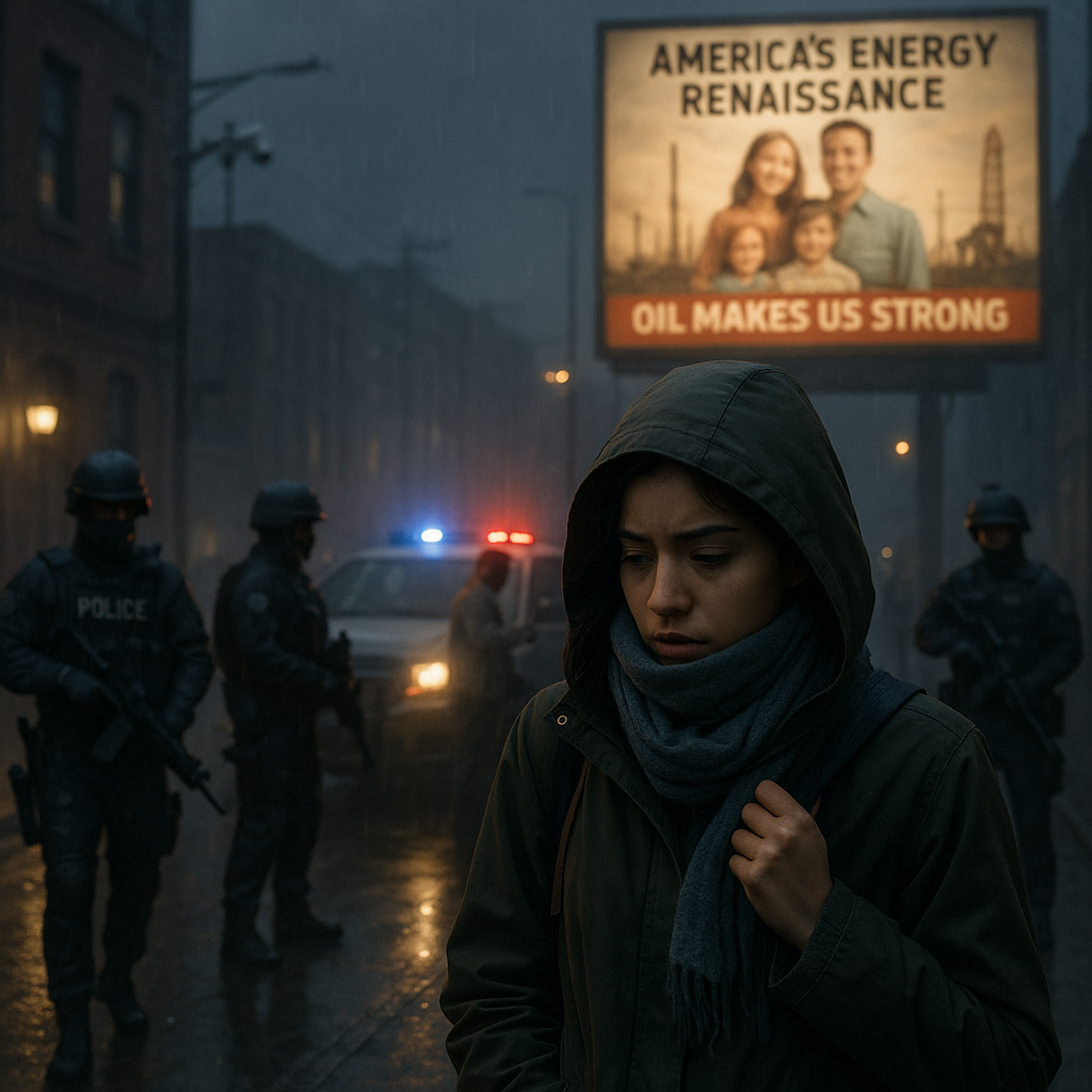 Further down, a massive billboard glows against the night: “America’s Energy Renaissance—Oil Makes Us Strong.”⁷ The smiling family in the image stands against a backdrop of pipelines and drill rigs. Elena thinks of the Ohio River swelling each spring, edging closer to the streets where she lives. Floods batter Asia, Africa, South America, but the news calls them “opportunities for American leadership.” Relief is privatized now, meted out through insurance firms that deny more claims than they approve. With the U.S. long gone from the Paris Agreement,⁸ the future looks as fragile as the papers tucked in her bag.