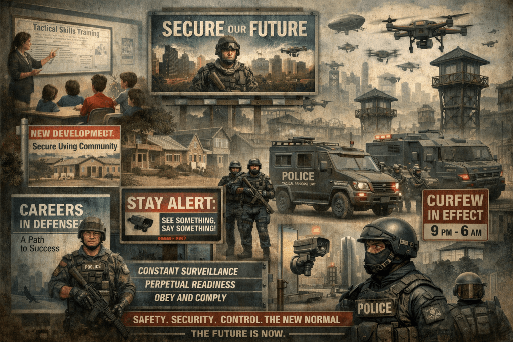 Our militarized future did not arrive as a parade. It arrived as curriculum, budget line, land use plan, and normalized emergency. It arrived in the language of opportunity and the architecture of routine. Before the drones were visible and the tactical hardware was familiar, the cultural groundwork was already laid: permanent mobilization repackaged as atmosphere, as safety, as the reasonable shape of modern life. The dystopian imagination was not warning us. It was preparing us. The preparation is largely complete. Militarized dystopia for controlling the masses is now government policy.1